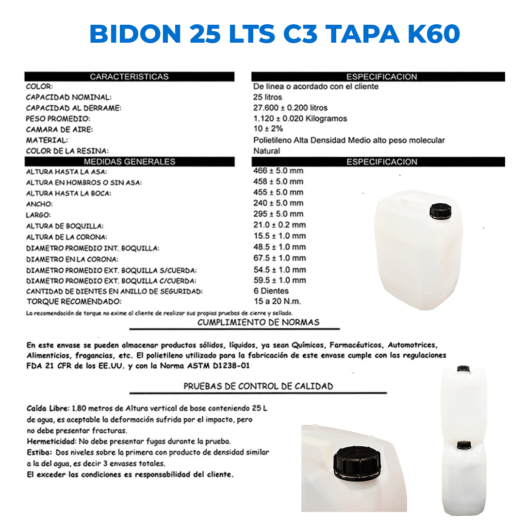 Descripción: Envase de polietileno color natural, modelo "C3", tapón negro de rosca tipo "K60", con arillo poliform y sello de inviolabilidad, estibable.