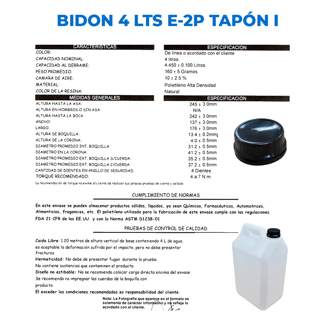 Descripción: Envase de polietileno color natural modelo "E2P", con un peso de 160 grs. Tapón "I" negro de rosca con arillo poliform y sello de inviolabilidad no estibable. Paquete de 50 piezas.
