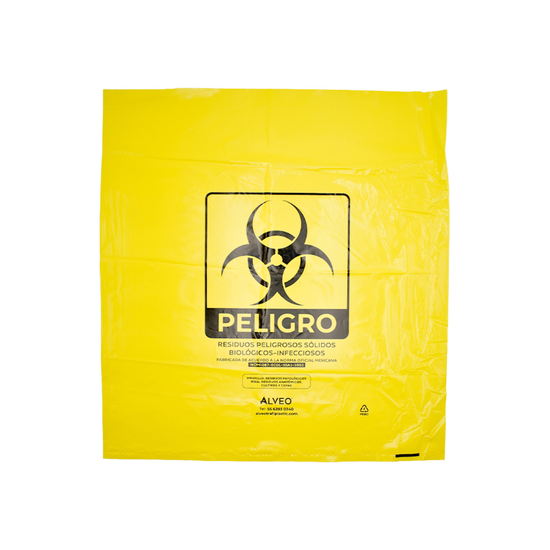 Descripción: Bolsa de polietileno de baja densidad, libre de metales pesados para la recolección de residuos biológico infecciosos. Carga Máxima: 18 kg. Impresa a una tinta con logotipo de biológico infeccioso. Con fuelles. Calibre 300. Medidas: Ancho: 50.0 cm. Alto: 65.0 cm. Color: Amarillo. Pedido mínimo 5,000 piezas.