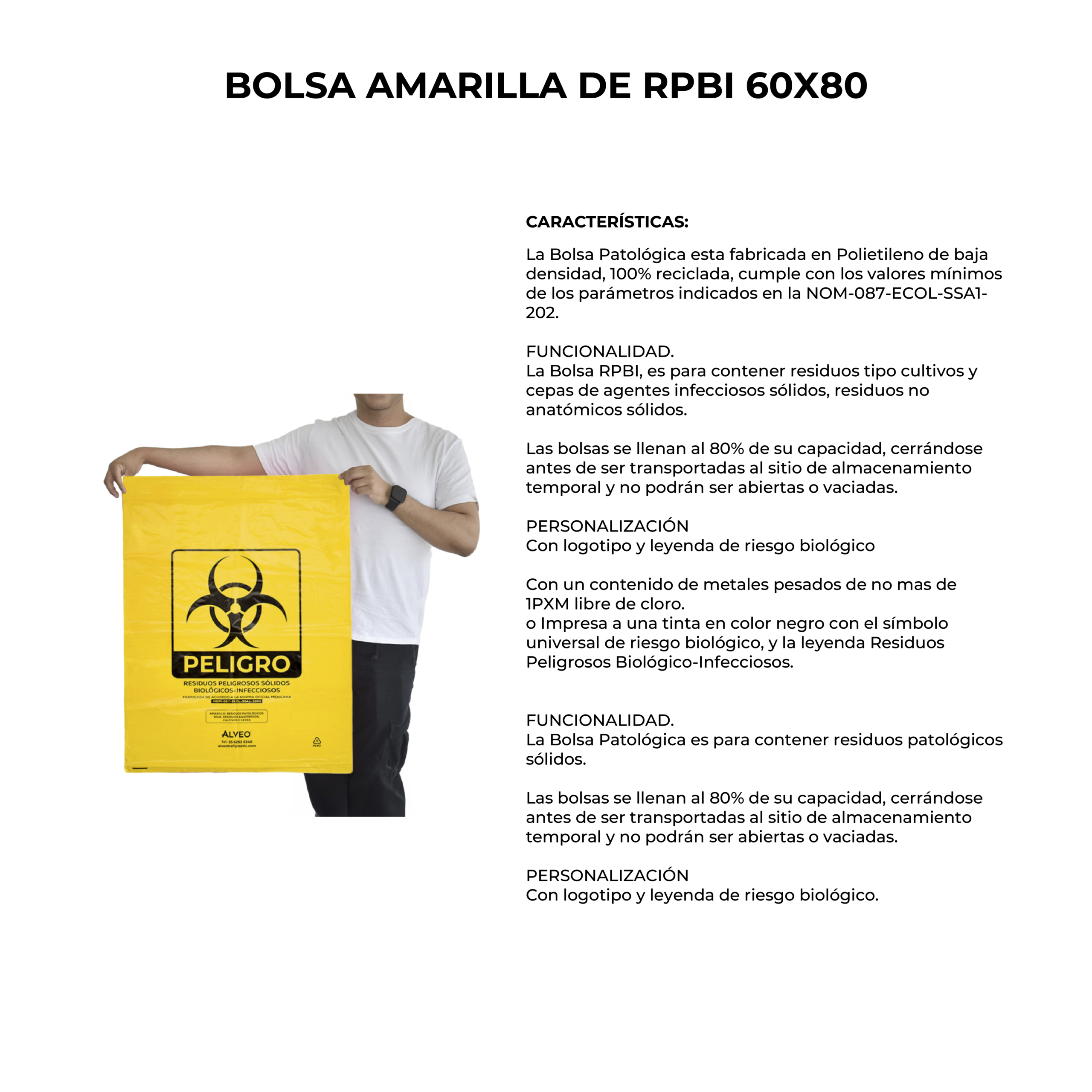 Descripción: Bolsa de polietileno de baja densidad, libre de metales pesados para la recolección de residuos biológico infecciosos. Carga Máxima: 18 kg. Impresa a una tinta con logotipo de biológico infeccioso. Con fuelles. Calibre 300. Medidas: Ancho: 60.0 cm. Alto: 80.0 cm. Color: Amarillo.