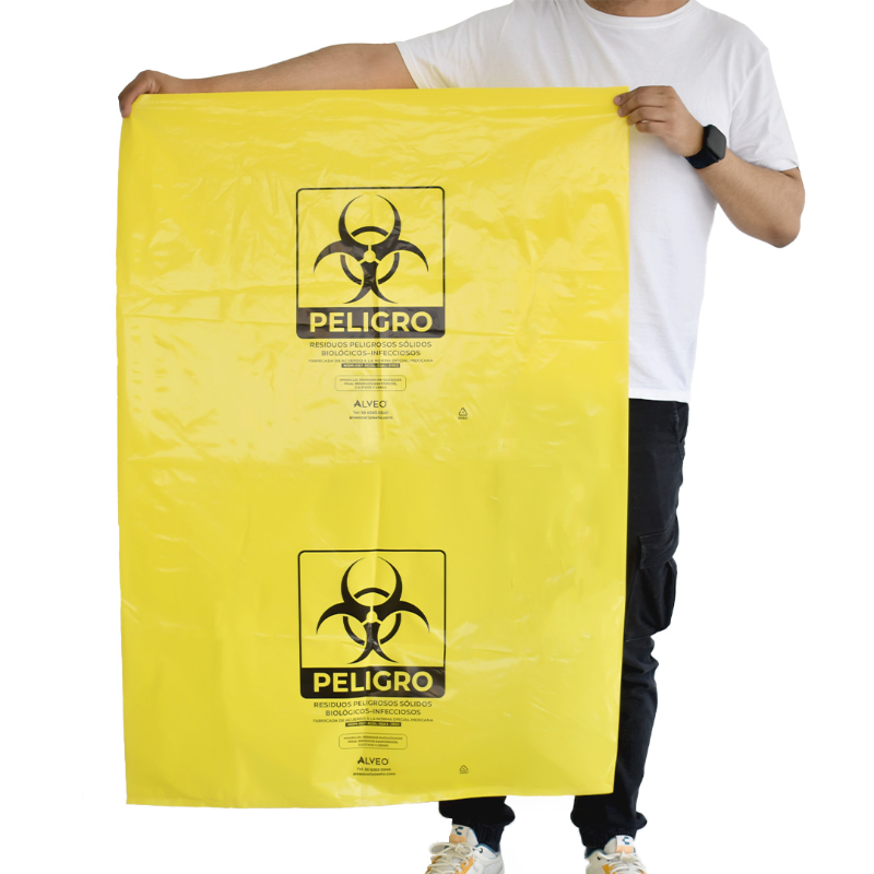 Descripción: Bolsa de polietileno de baja densidad, libre de metales pesados para la recolección de residuos biológico infecciosos. Carga Máxima: 25 kg. Impresa a una tinta con logotipo de biológico infeccioso. Con fuelles. Calibre 300. Medidas: Ancho: 78.0 cm. Alto: 109.0 cm. Color: Amarillo.