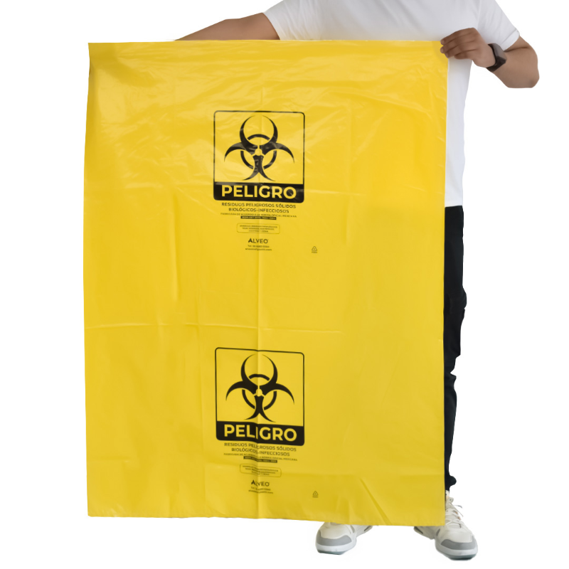 Descripción: Bolsa de polietileno de baja densidad, libre de metales pesados para la recolección de residuos biológico infecciosos. Carga Máxima: 28 kg. Impresa a una tinta con logotipo de biológico infeccioso. Con fuelles. Calibre 300. Medidas: Ancho: 90.0 cm. Alto: 120.0 cm. Color: Amarillo.