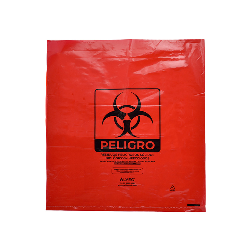 Descripción: Bolsa de polietileno de baja densidad, libre de metales pesados para la recolección de residuos biológico infecciosos. Carga Máxima: 8 kg. Impresa a una tinta con logotipo de biológico infeccioso. Con fuelles. Calibre 300. Medidas: Ancho: 55.0 cm. Alto: 60.0 cm. Color: Rojo.