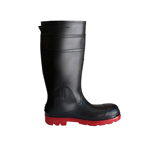 Descripción: Bota fabricada en color negro y suela roja. Resistente a trabajo pesado, sustancias químicas, productos grasos vegetales y animales, solventes y ácidos, con suela antiderrapante, forro interior de calcetín de algodón / poliéster para gran frescura. Ofrece gran durabilidad, resistencia y comodidad. Altura de caña 40.0 cm. Sin casquillo. color: Negra / roja. Talla: de la 24 a la 32.