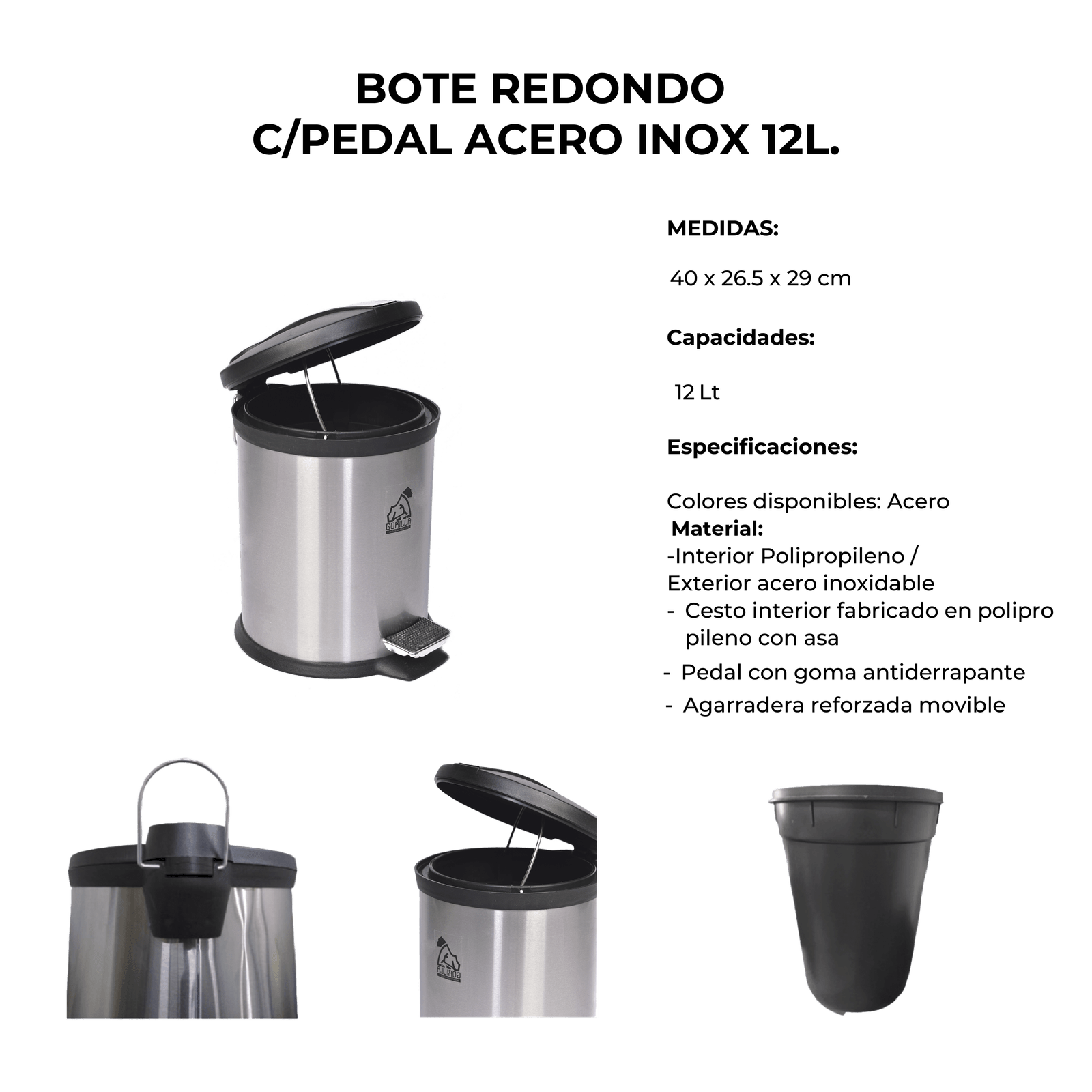 Descripción: Bote Redondo Acero Inoxidable, Capacidades: 12 Lt., Color: Acero, Medidas: 40 X 26.5 X 29 Cm, Material: Interior Polipropileno / Exterior Acero Inoxidable.