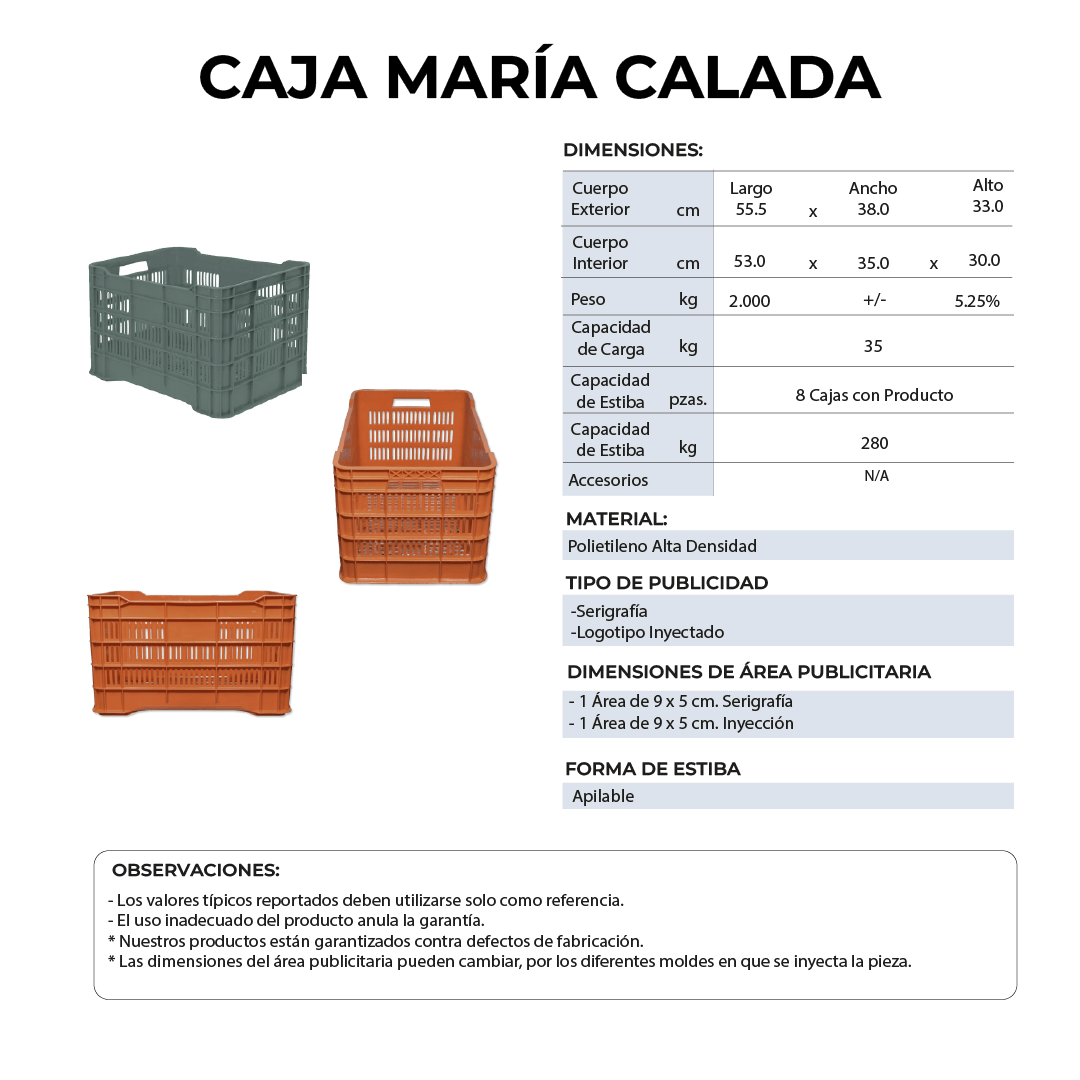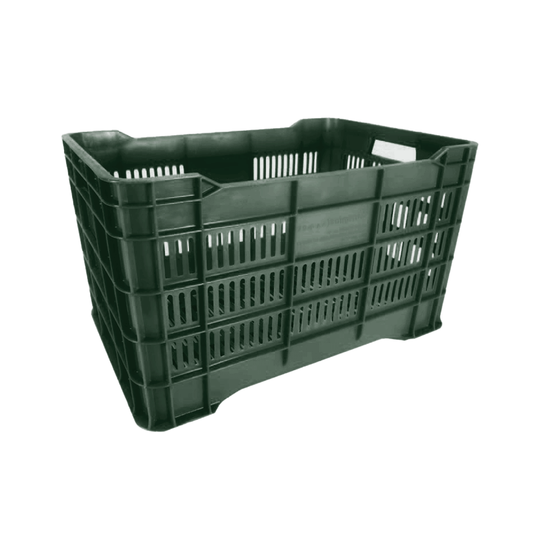 Descripción: Material: Polietileno de reproceso. Medidas: Largo: 55.5 cm. Ancho: 38.0 cm. Alto: 33.0 cm. Peso: 2.005 Kg. Capacidad: 35 Kg. Forma de estiba/empaque: Apilable. Condiciones de estiba: 8 piezas con producto. Color: Verde. Sujeto a disponibilidad. En reproceso no se garantiza color.