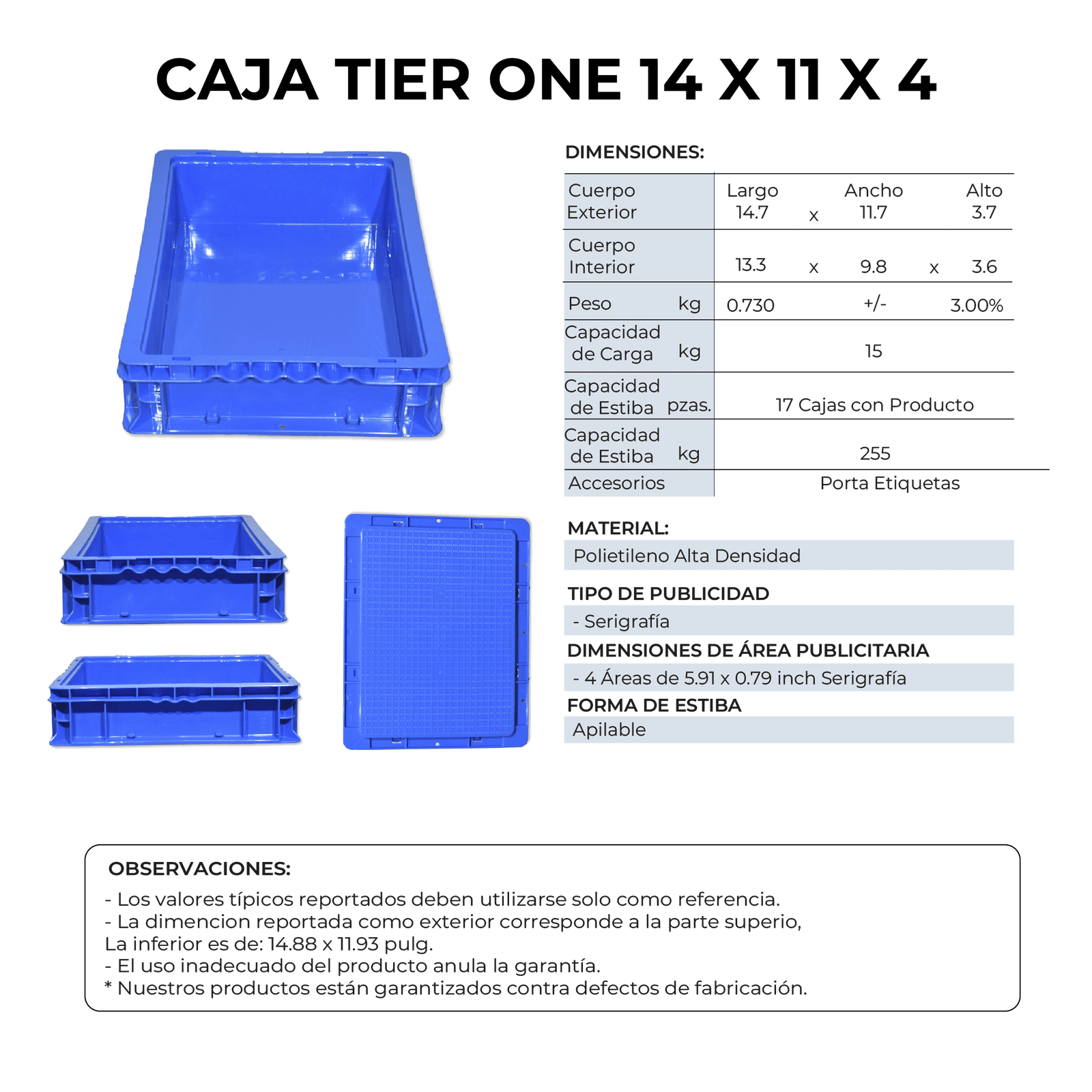 Descripción: Caja de plástico fabricada en polietileno de alta densidad virgen (HDPE). Capacidad de Carga: 15 Kgs. Color: Gris. Medidas: Largo: 35.56 cm. Ancho: 27.94 cm. Alto: 10.16 cm. Forma de estiba: Apilable. Condiciones de estiba 17 piezas con producto.