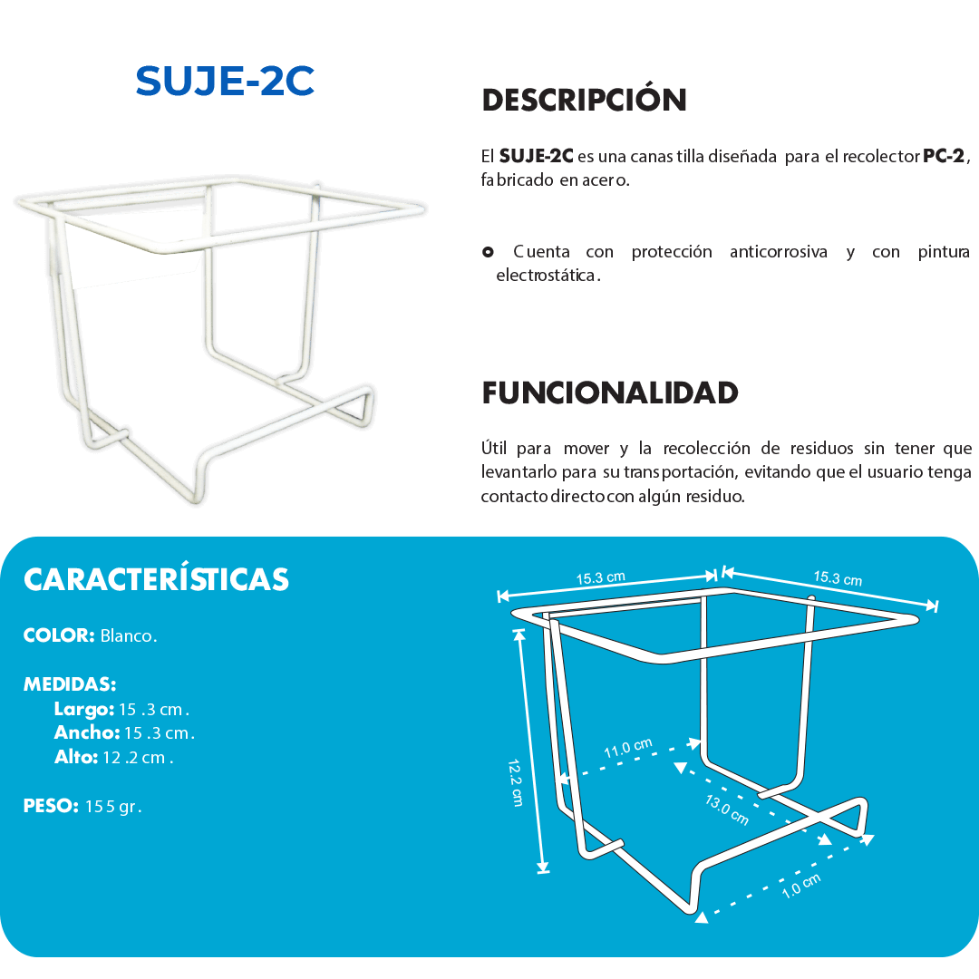 Descripción: Canastilla diseñada para colocar a la pared el contenedor PC- 2. Útil para la mover y recolección de residuos sin tener que levantarlo para su transportación, evitando que el usuario tenga contacto directo con algún residuo. COLOR: Blanco. MEDIDAS: Largo: 15.3 cm. Ancho: 15.3 cm. Alto: 12.2 cm. PESO: 155 gr