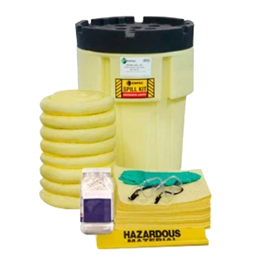 En un derrame el tiempo de reacción se convierte en su activo más valioso. Diseñado para derrames tipo HazMat para ser utilizados con químicos extremadamente peligrosos como ácidos y cáusticos. Aprobado por Normas: 29 CFR 1910.1450(e), 40 CFR 112.7, 40 CFR 122.26, 40 CFR 263.30(a), 40 CFR 263.31, EPA, SPCC y NPDES. Incluye 50 toallas absorbentes, 8 calcetines absorbentes, 4 bolsas para Residuos Peligrosos, 2 guantes de Nitrilo, 2 goggles de seguridad, 1 absorbente granular y 1 Tambor de Salvamento (Poly SpillPack). Medidas: 70.48 x 58 x 92.25 cm. Peso: 21 Kg. Capacidad de absorbentes: 132 Lts. Capacidad del contenedor: 378 Lts.