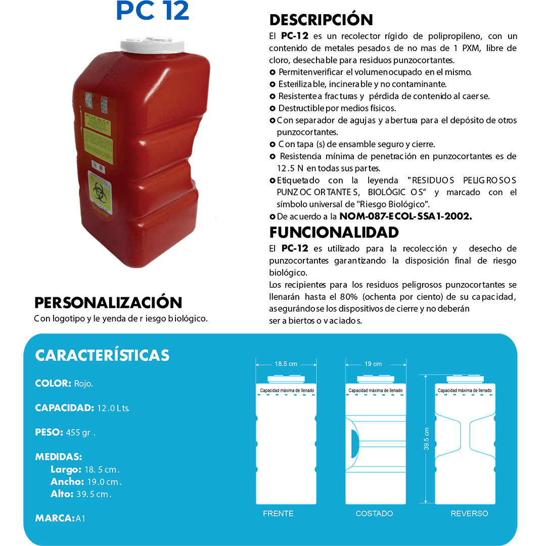Descripción: Recolector de de polipropileno para punzocortante. Capacidad volumen: 12.0 Lts. Medidas: Largo: 18.0 cm. Ancho: 19.5 cm. Alto:40.60 cm.