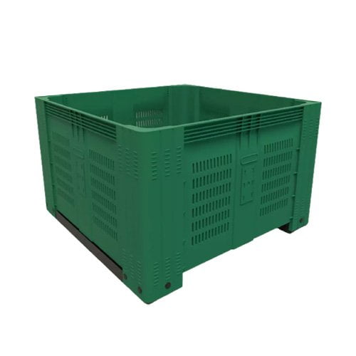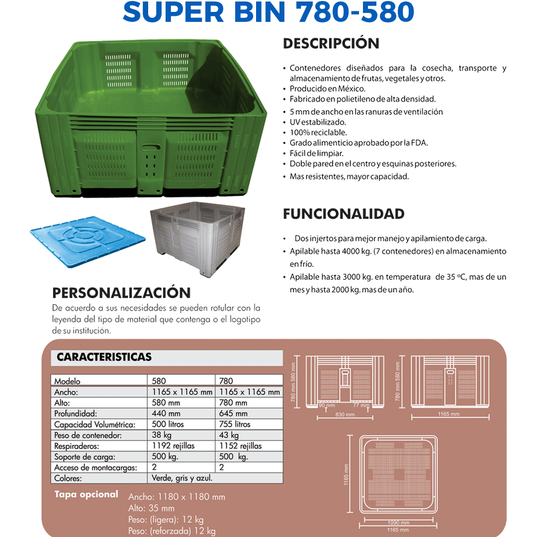 Descripción: Contenedor fabricado en polietileno de alta densidad. Grado alimenticio aprobado por la FDA. Doble pared en el centro y esquinas posteriores que refuerzan el contenedor. Soporte de carga comprobada hasta 500 Kg. Apilable hasta 4000 Kg en almacenamiento en frío. Apilable hasta 3000 Kg. en temperatura de 35° C más de un mes, y hasta 2000 Kg. más de un año. Con ranuras de ventilación. Capacidad: 780 Lts. Peso: 45 Kg. Profundidad: 645 mm Largo 1165 Ancho 1165 mm Alto: 780 mm Estiba Aprox: 3 Cont. Colores de línea: Verde, Azul y Gris.